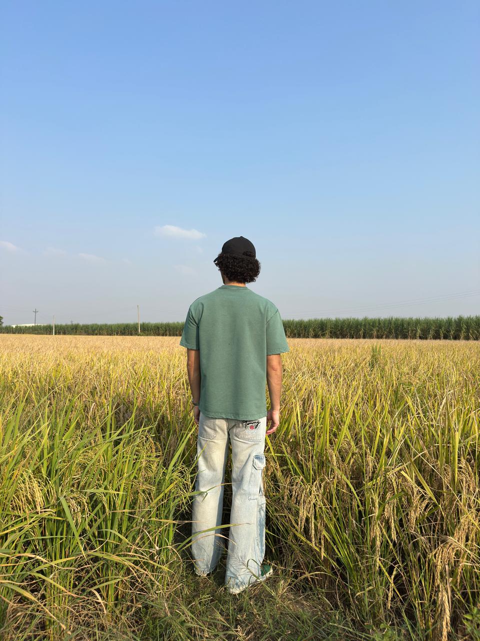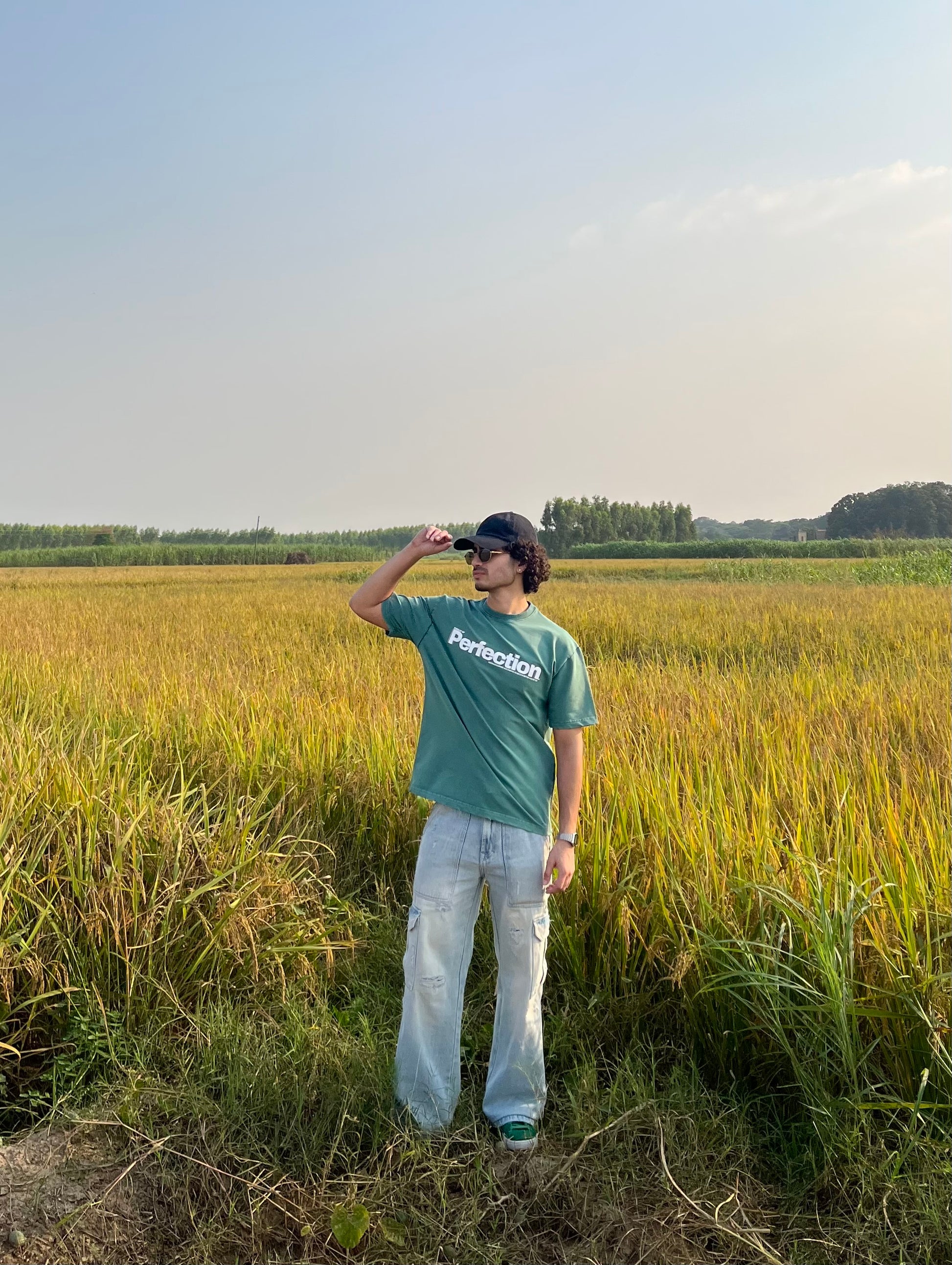 The Pursuit of Perfection Acid-Washed Malachite Green T-Shirt with White print— a fusion of earthy olive and aqua-toned green. That dynamic, mood-shifting color makes it more versatile. Under daylight, it reflects a green calm, while under shade it leans into a rich muted olive, giving the fabric a multi-dimensional tone