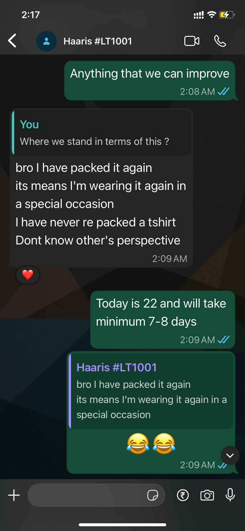 - No returns unless the item is damaged or defective.(We currently have a limited stock of 120 T-shirts, and every order is inspected before dispatch.)